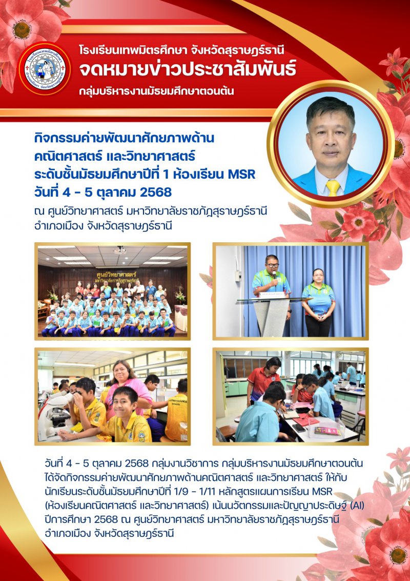 วันที่ 4-5 ตุลาคม 2568 กลุ่มงานวิชาการ กลุ่มบริหารงานมัธยมศึกษาตอนต้น ได้จัดกิจกรรมค่ายพัฒนาศักยภาพด้านคณิตศาสตร์ และวิทยาศาสตร์ ให้กับนักเรียนระดับชั้นมัธยมศึกษาปีที่ 1/9 - 1/11