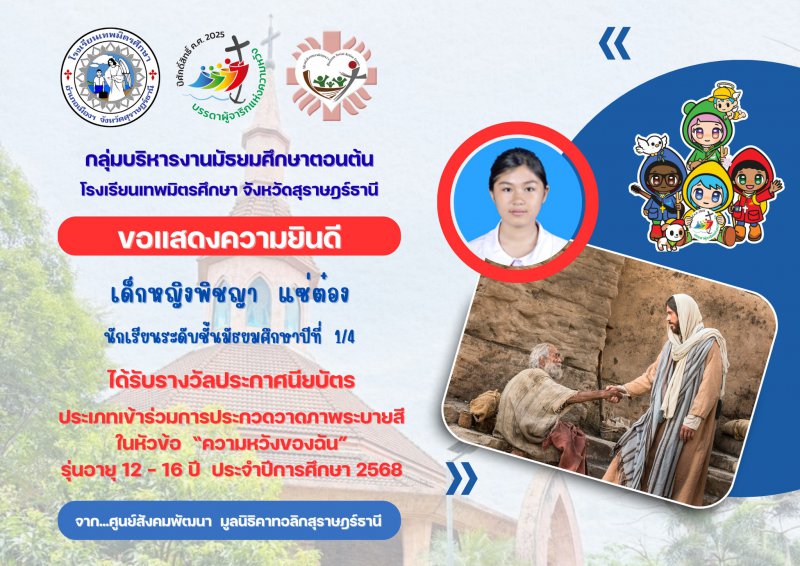 โรงเรียนเทพมิตรศึกษา ขอแสดงความยินดีแก่นักเรียนระดับชั้นมัธยมศึกษาปีที่ 1-3 ในโอกาสที่ได้รับรางวัลประกาศนียบัตร ประเภทเข้าร่วมการประกวดวาดภาพระบายสี ในหัวข้อ "ความหวังของฉัน" รุ่นอายุ 12-16 ปี