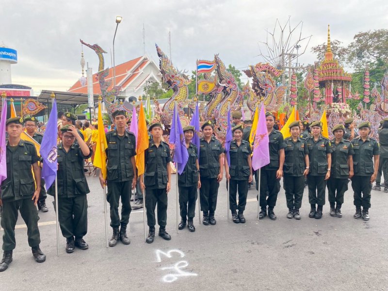นักศึกษาวิชาทหารโรงเรียนเทพมิตรศึกษา ร่วมขบวนแห่เรือพนมพระ งานประเพณีชักพระ - ทอดผ้าป่า และแข่งเรือยาว จังหวัดสุราษฎร์ธานีประจำปี 2568