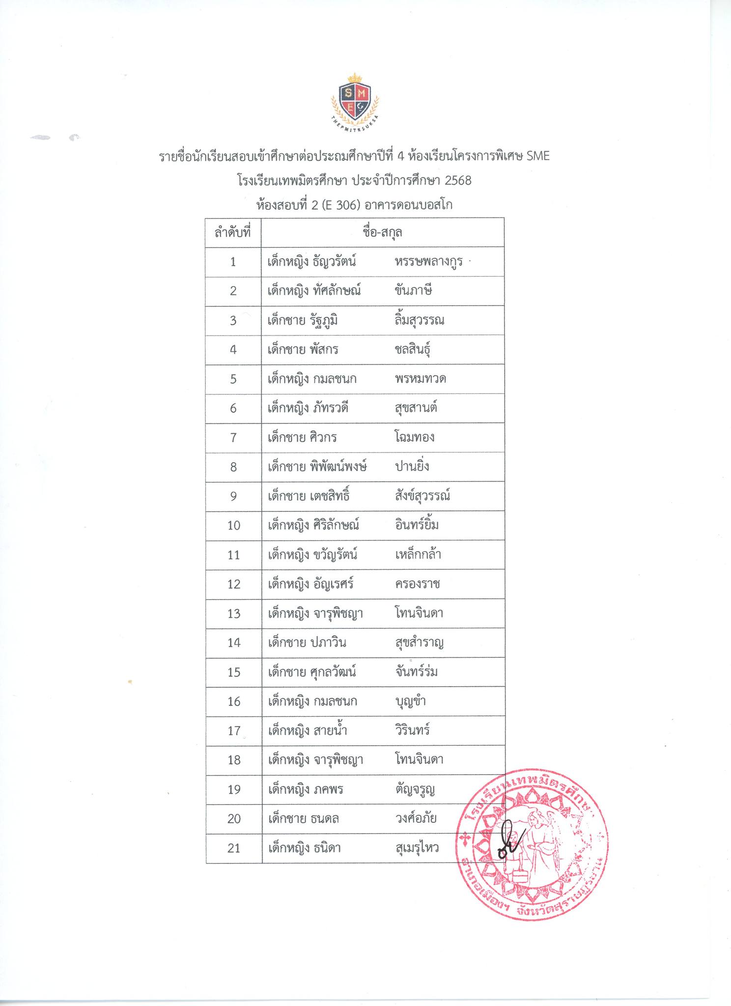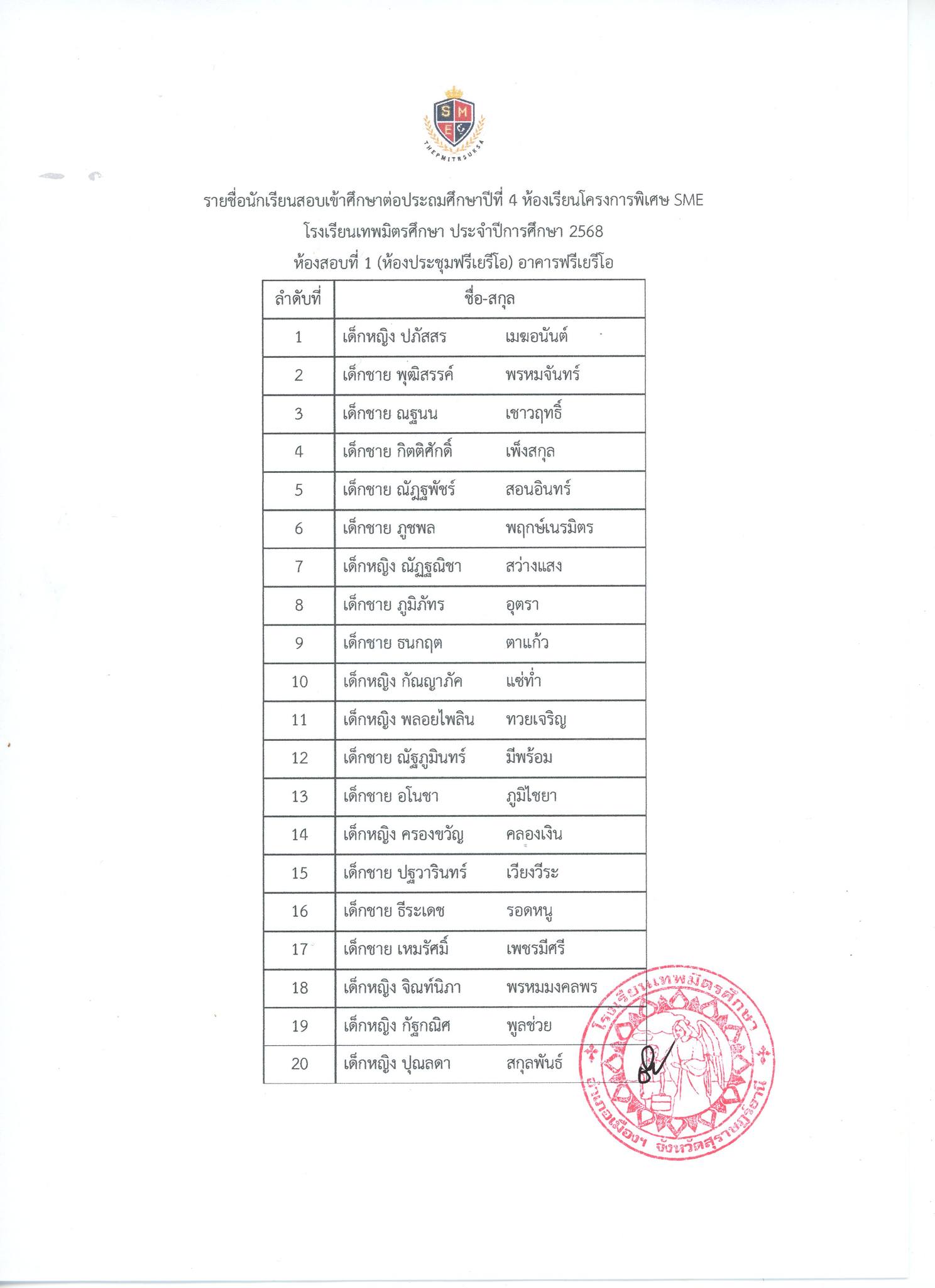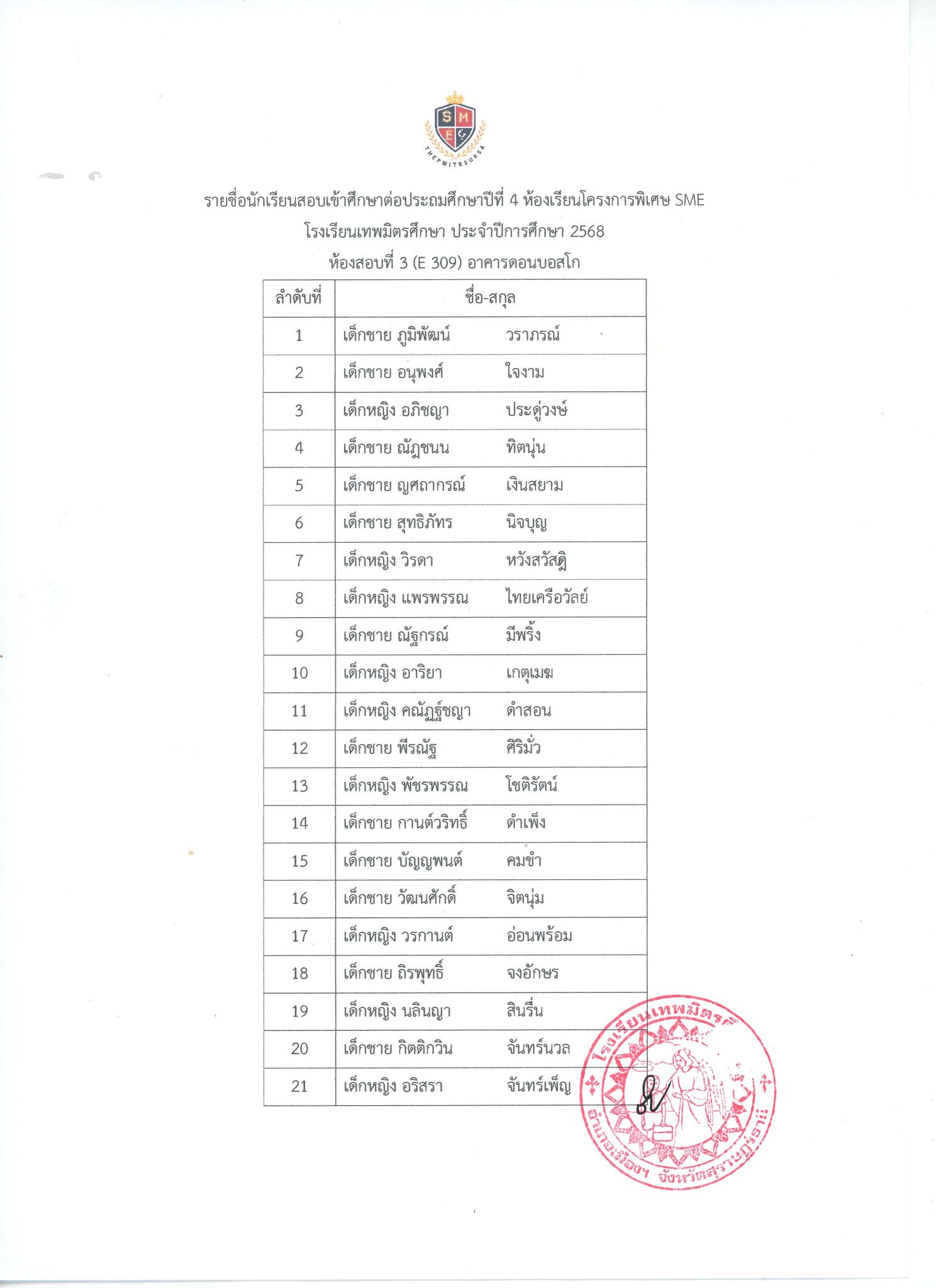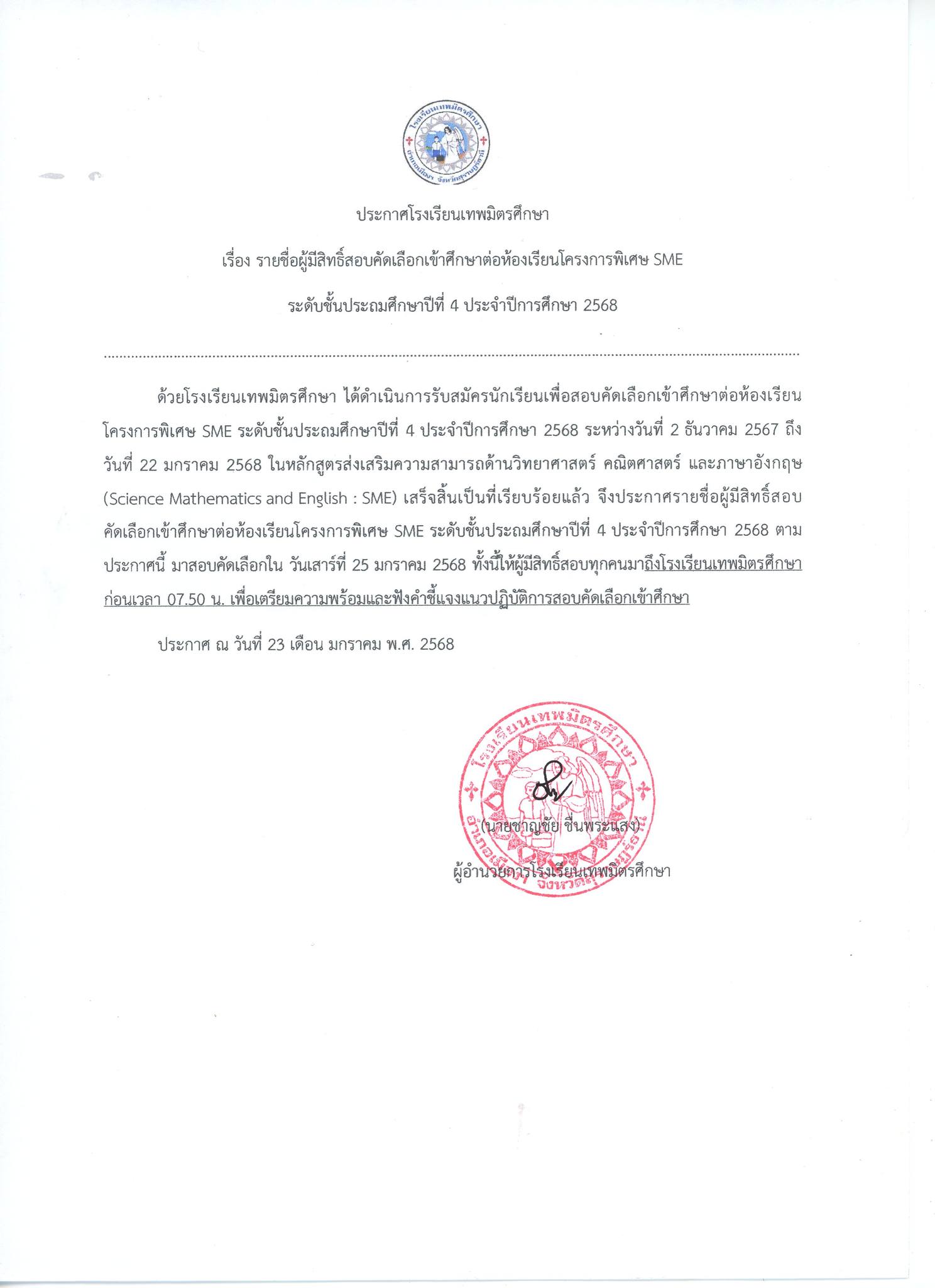 โรงเรียนเทพมิตรศึกษาประกาศรายชื่อผู้มีสิทธิ์สอบคัดเลือกเข้าศึกษาต่อห้องเรียนโครงการ SME ระดับชั้นประถมศึกษาปีที่ 4 ประจำปีการศึกษา 2568