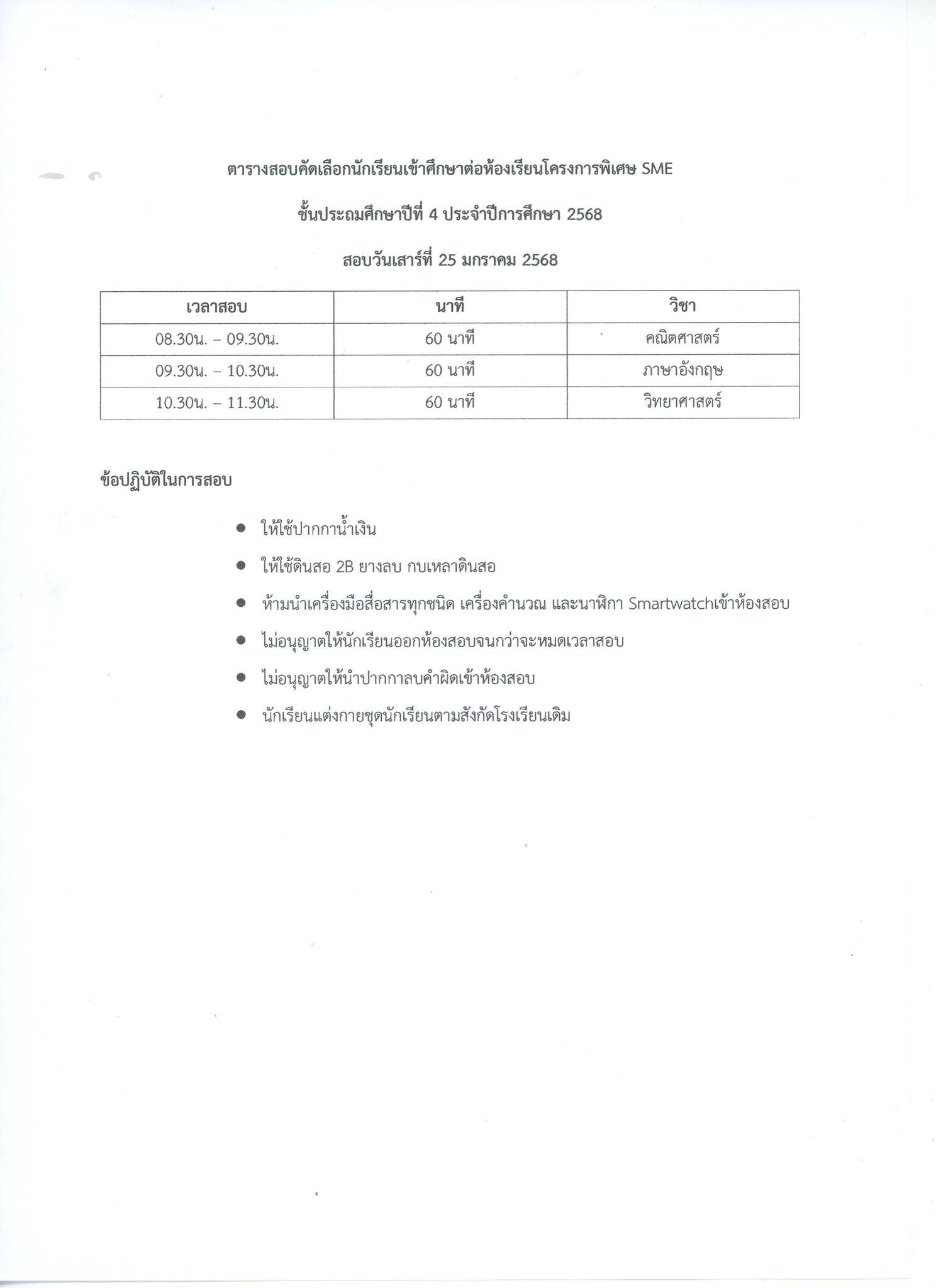 หมายเหตุ ขอให้นักเรียนมาถึงสถานที่สอบก่อนเวลา 07.50 น. เพื่อฟังคำชี้แจงแนวปฎิบัติในการสอบคัดเลือก