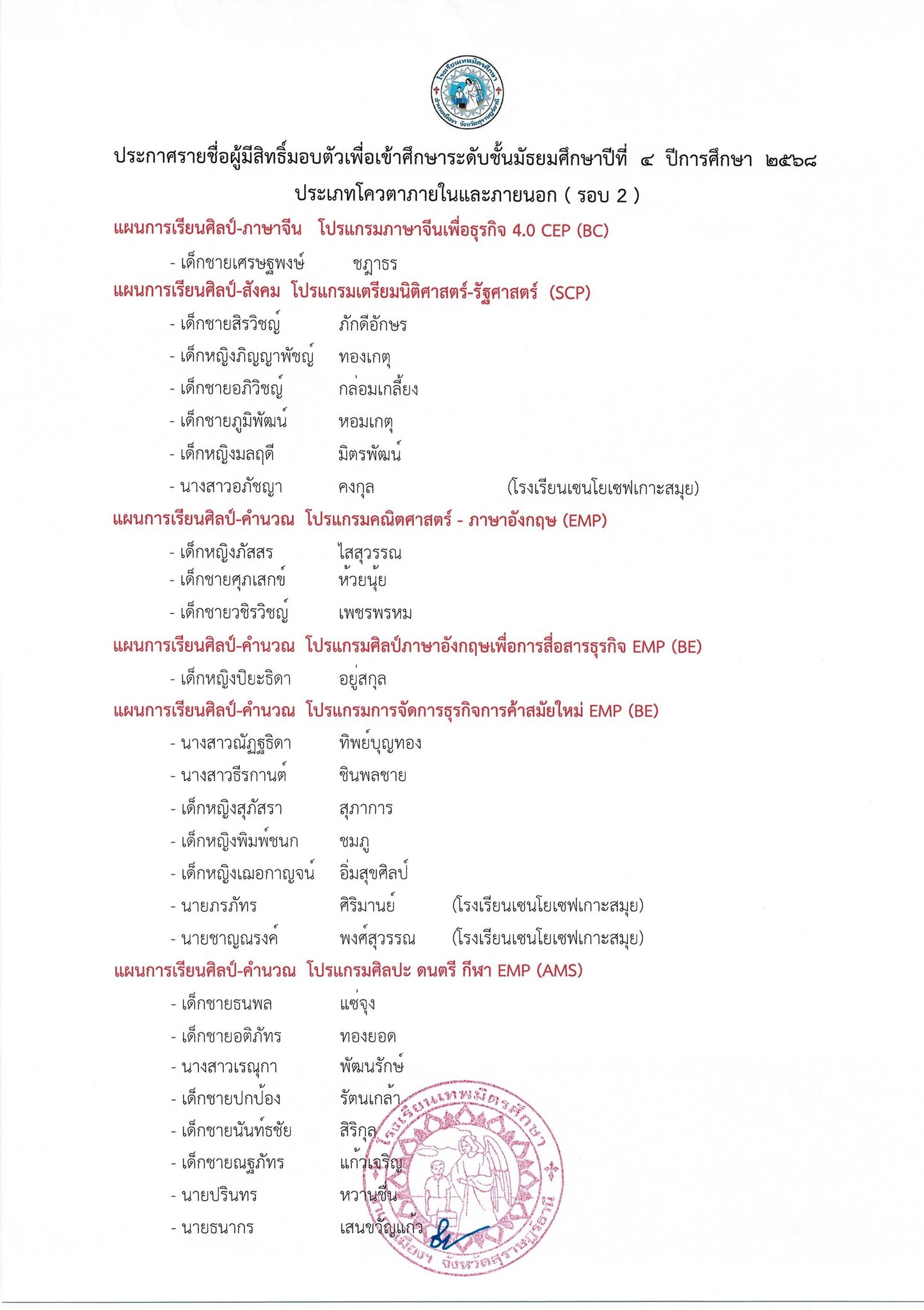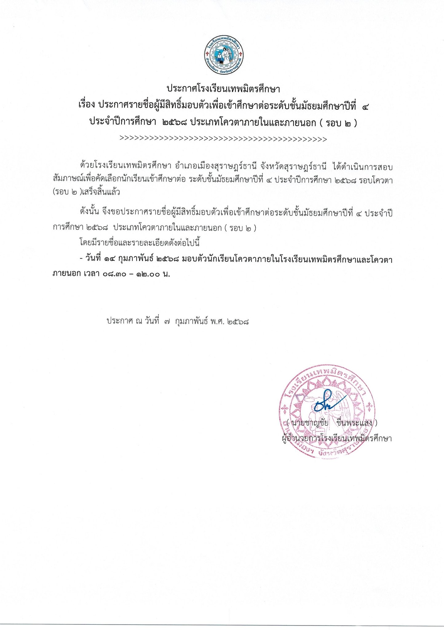 » ประกาศรายชื่อเพิ่มเติม (รอบ 2) ผู้มีสิทธิ์มอบตัวเพื่อเข้าศึกษาต่อระดับมัธยมศึกษาปีที่ 4 ปีการศึกษา 2568 ประเภทโควตาภายในและภายนอก (รอบ2)