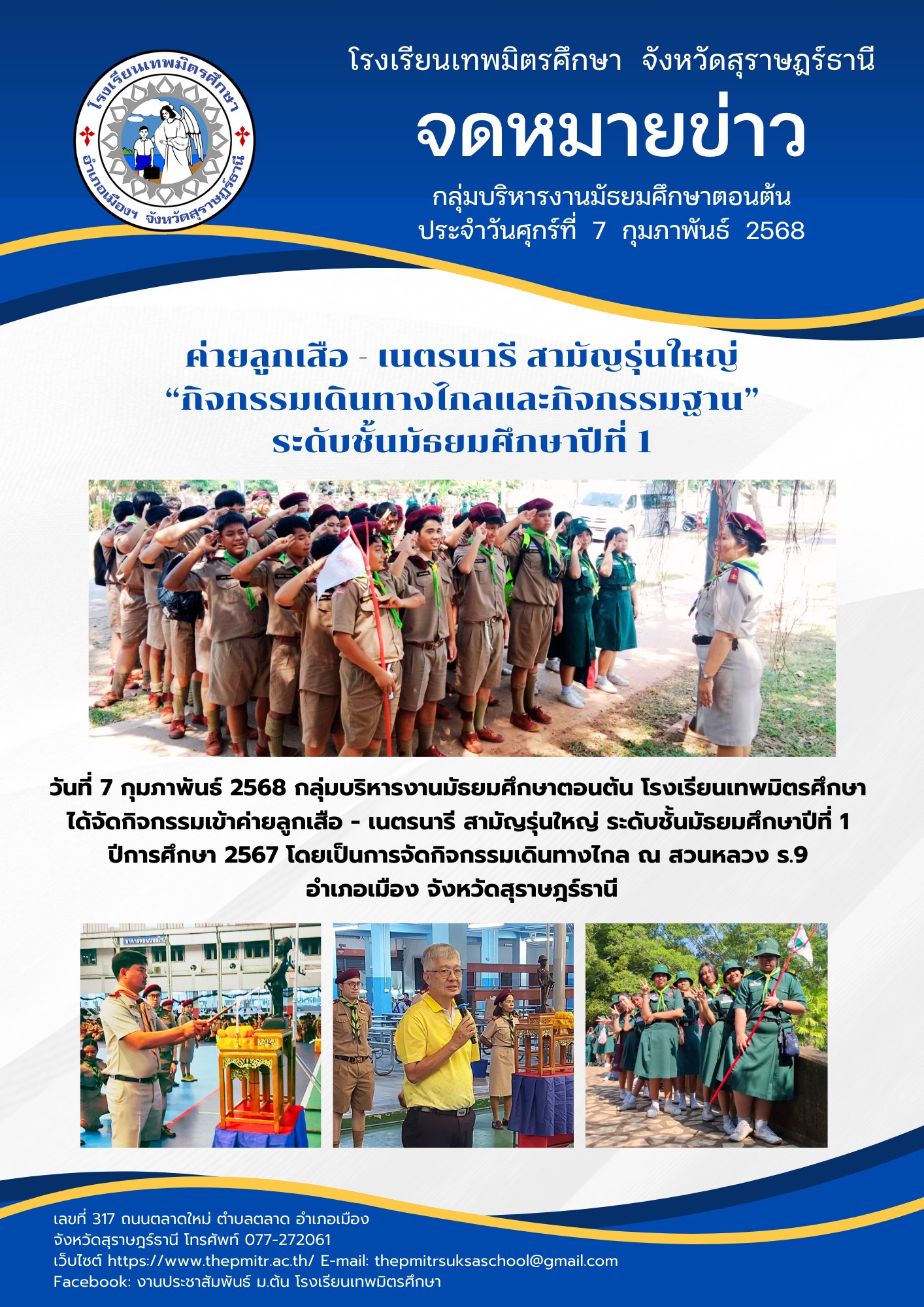 » กิจกรรมของโรงเรียน » วันที่ 7 กุมภาพันธ์ 2568 กลุ่มบริหารงานมัธยมศึกษาตอนต้น โรงเรียนเทพมิตรศึกษา ได้จัดกิจกรรมเข้าค่ายลูกเสือ-เนตรนารี สามัญรุ่นใหญ่ ระดับชั้นมัธยมศึกษาปีที่ 1 ปีการศึกษา 2567
