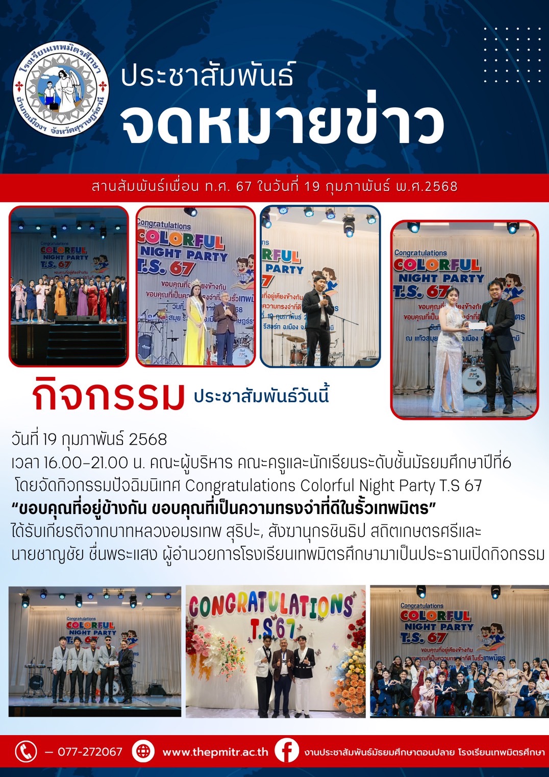 » วันที่ 19 กุมภาพันธ์ 2568 เวลา 16.00-21.00 น. คณะครูและนักเรียนระดับชั้นมัธยมศึกษาปีที่ 6 โดยจัดกิจกรรมปัจฉิมนิเทศ