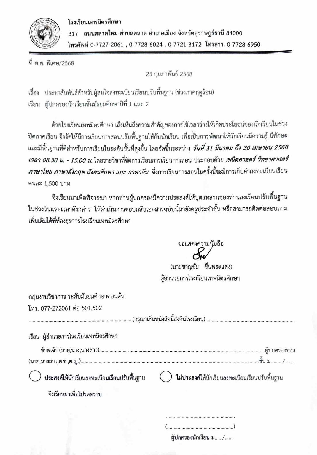 เปิดรับสมัครนักเรียนห้องเรียนทั่วไป ภาคเรียนที่ 2/2568