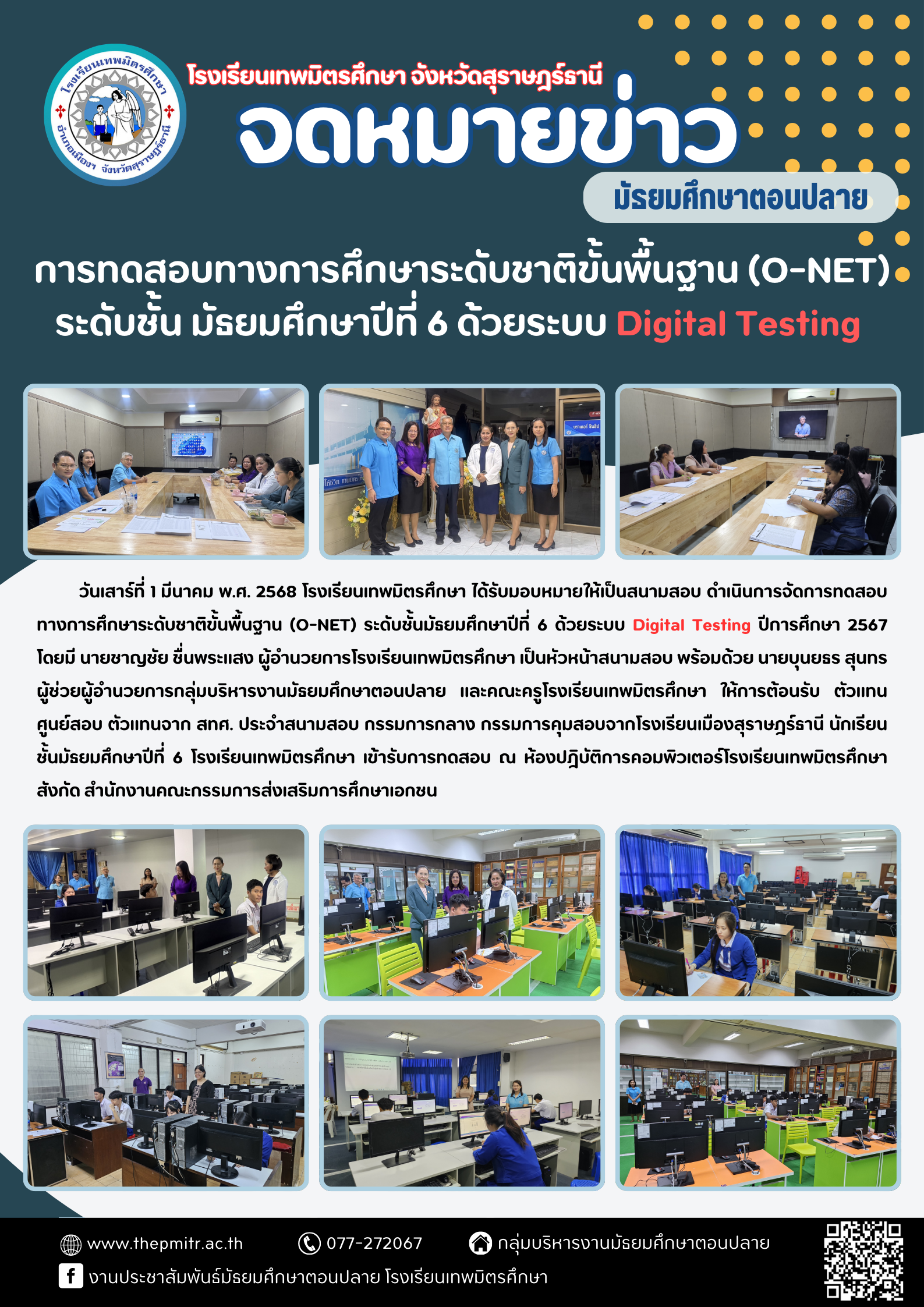 » กิจกรรมของโรงเรียน » วันเสาร์ที่ 1 มีนาคม พ.ศ. 2568 โรงเรียนเทพมิตรศึกษา ได้รับมอบหมายให้เป็นสนามสอบ ดำเนินการจัดการสอบทางการศึกษาระดับชาติขั้นพื้นฐาน (O-NET) ระดับชั้น ม.6 ด้วยระบบ Digital Testing ปีการศึกษา 2567