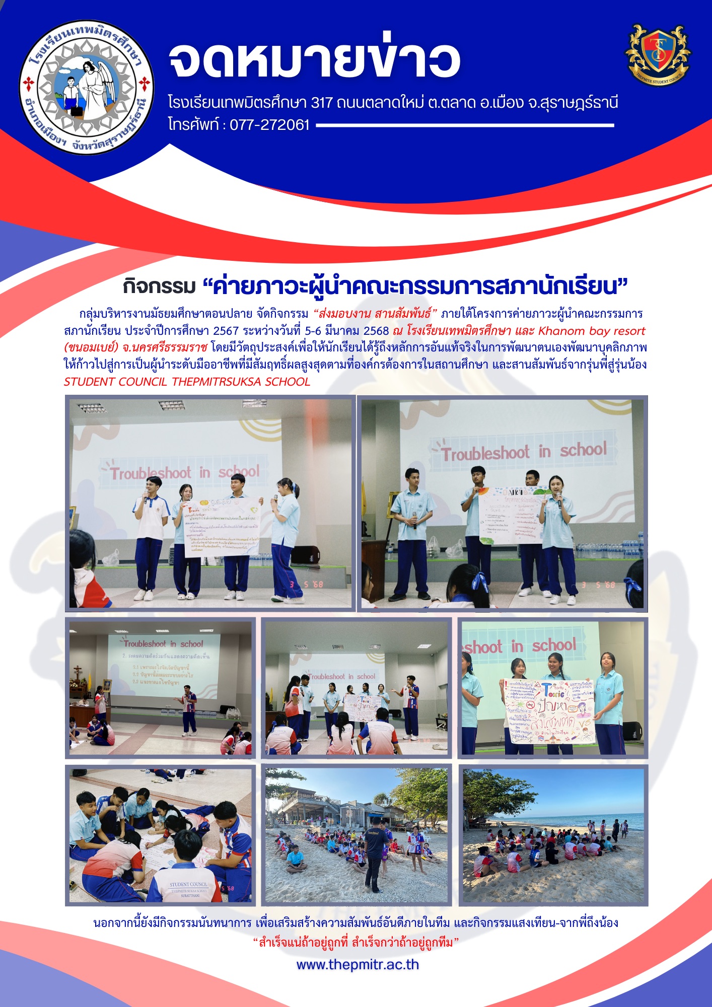 » กลุ่มบริหารงานมัธยมศึกษาตอนปลาย จัดกิจกรรม "ส่งมอบสานสัมพันธ์" ภายใต้โครงการค่ายภาวะผู้นำคณะกรรมการสภานักเรียน ประจำปีการศึกษา 2567