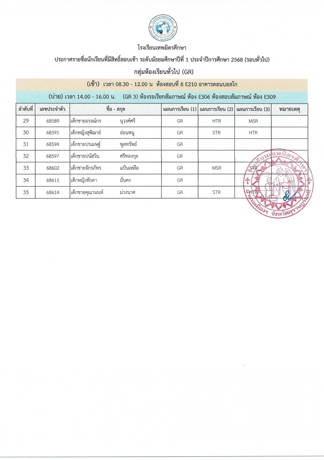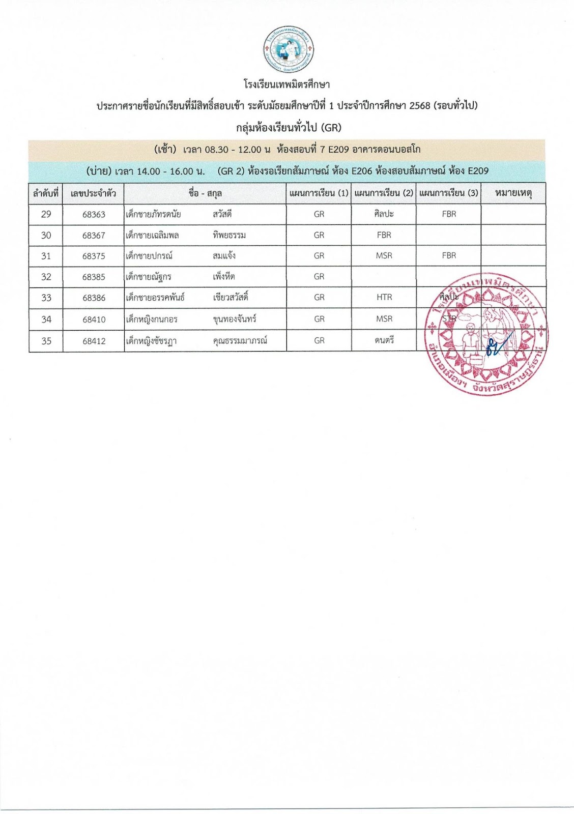 » ข่าวประชาสัมพันธ์ » ประกาศรายชื่อผู้มีสิทธิ์สอบเข้าศึกษาต่อระดับชั้นมัธยมศึกษาปีที่ 1 (รอบทั่วไป) ประจำปีการศึกษา 2568 สอบวันเสาร์ที่ 29 มีนาคม 2568 ณ อาคารดอนบอสโก โรงเรียนเทพมิตรศึกษา
