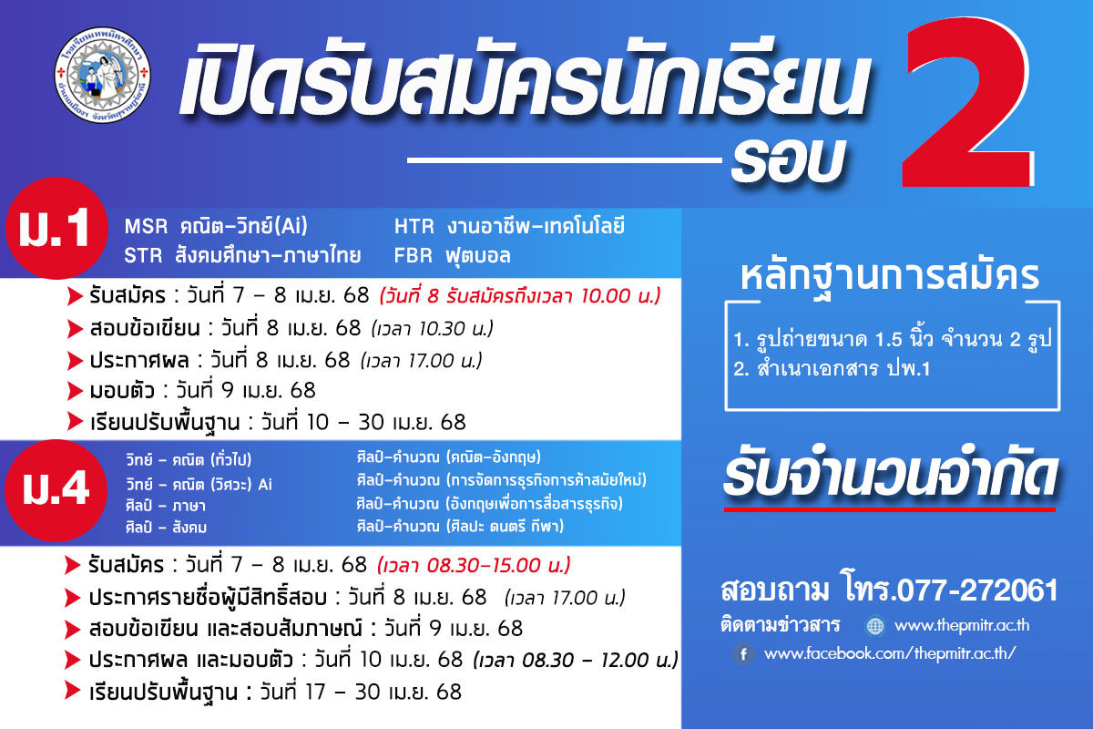 » โรงเรียนเทพมิตรศึกษาประกาศรับสมัครนักเรียน (รอบทั่วไป) ประจำปีการศึกษา 2568 รอบที่ 2