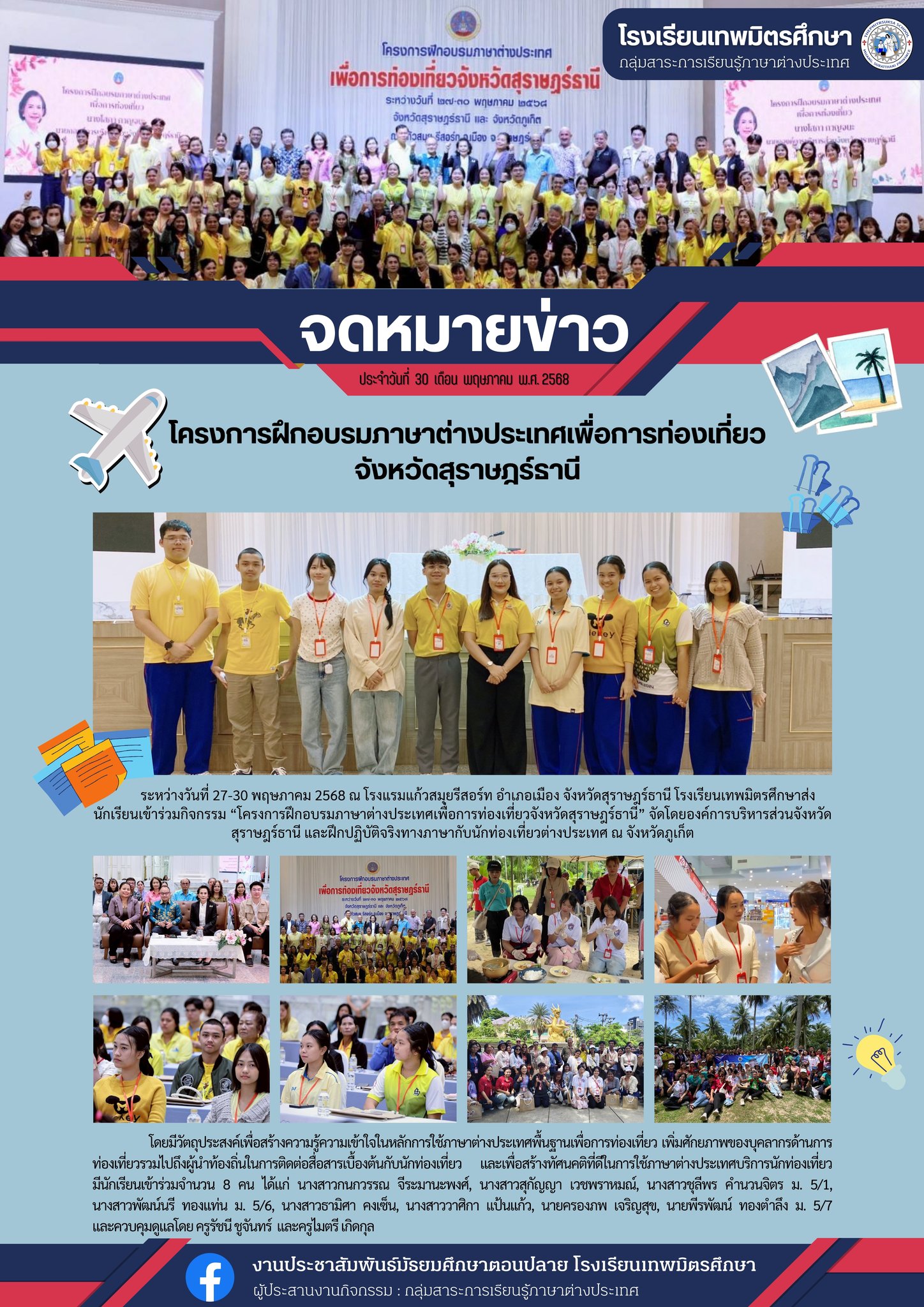 » กิจกรรมของโรงเรียน » ตัวแทนนักเรียนโรงเรียนเทพมิตรศึกษาเข้าร่วมกิจกรรม โครงการฝึกอบรมภาษาต่างประเทศเพื่อการท่องเที่ยวจังหวัดสุราษฎร์ธานี จัดโดยองค์การบริหารส่วนจังหวัดสุราษฎร์ธานี