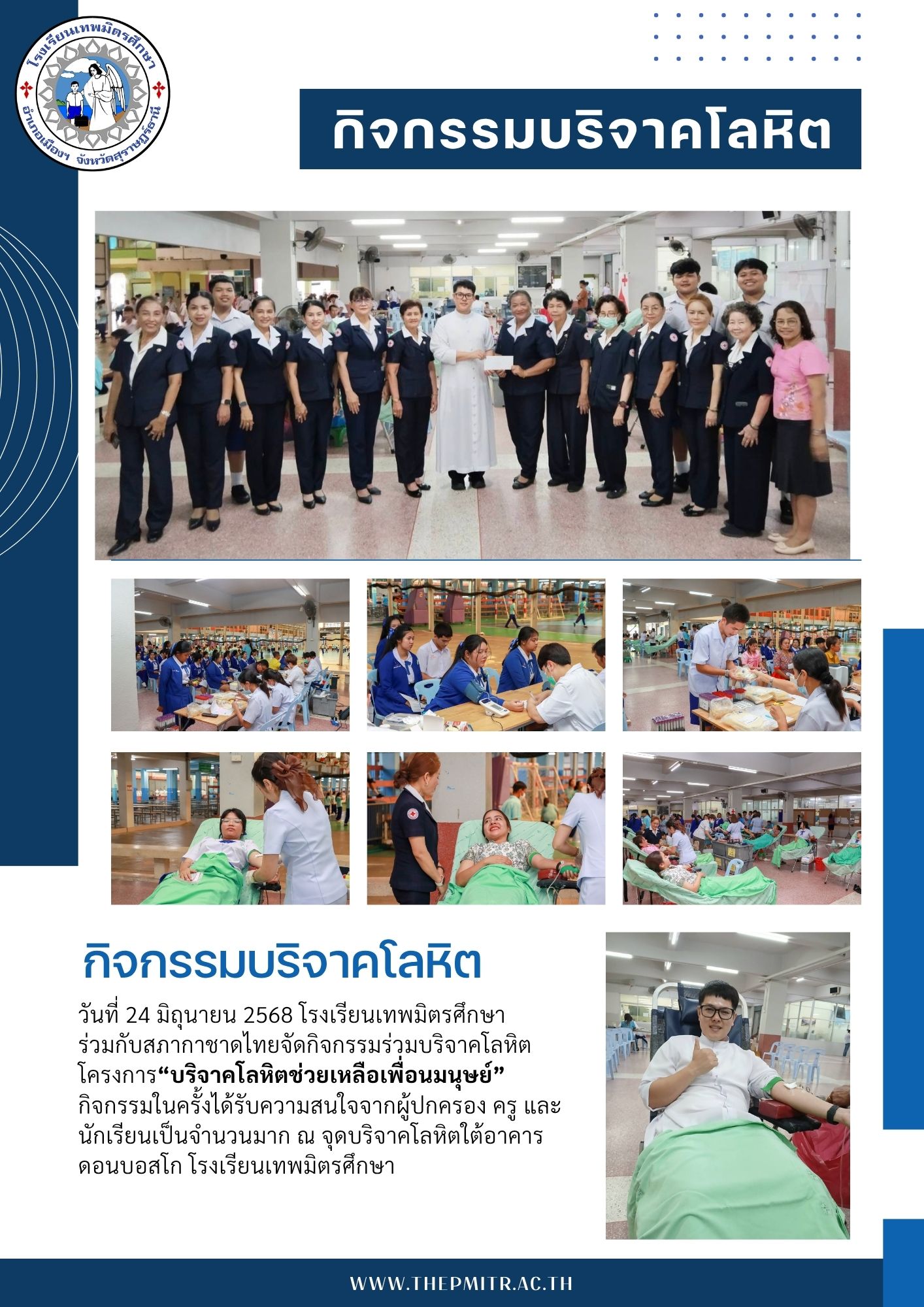 » วันที่ 24 มิถุนายน 2568 โรงเรียนเทพมิตรศึกษาร่วมกับสภากาชาดไทยจัดกิจกรรมร่วมบริจาคโลหิตโครงการ "บริจาคโลหิตช่วยเหลือเพื่อนมนุษย์"