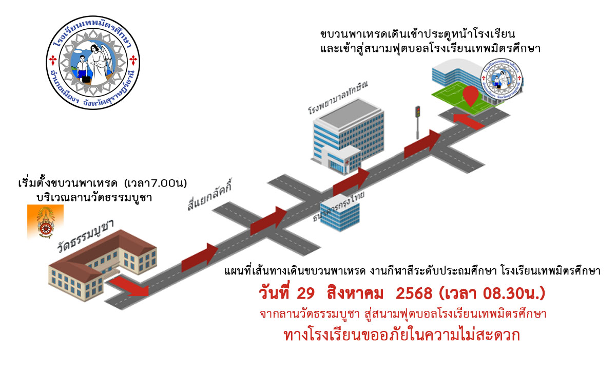 » ข่าวประชาสัมพันธ์ » แผนที่เส้นทางเดินขบวนพาเหรด ของนักเรียนระดับประถมศึกษา ในวันที่ 29 สิงหาคม 2568 เวลา 08.30 เริ่มเดินขบวนจากวัดธรรมบูชา เข้าสู่สนามฟุตบอลโรงเรียนเทพมิตรศึกษา