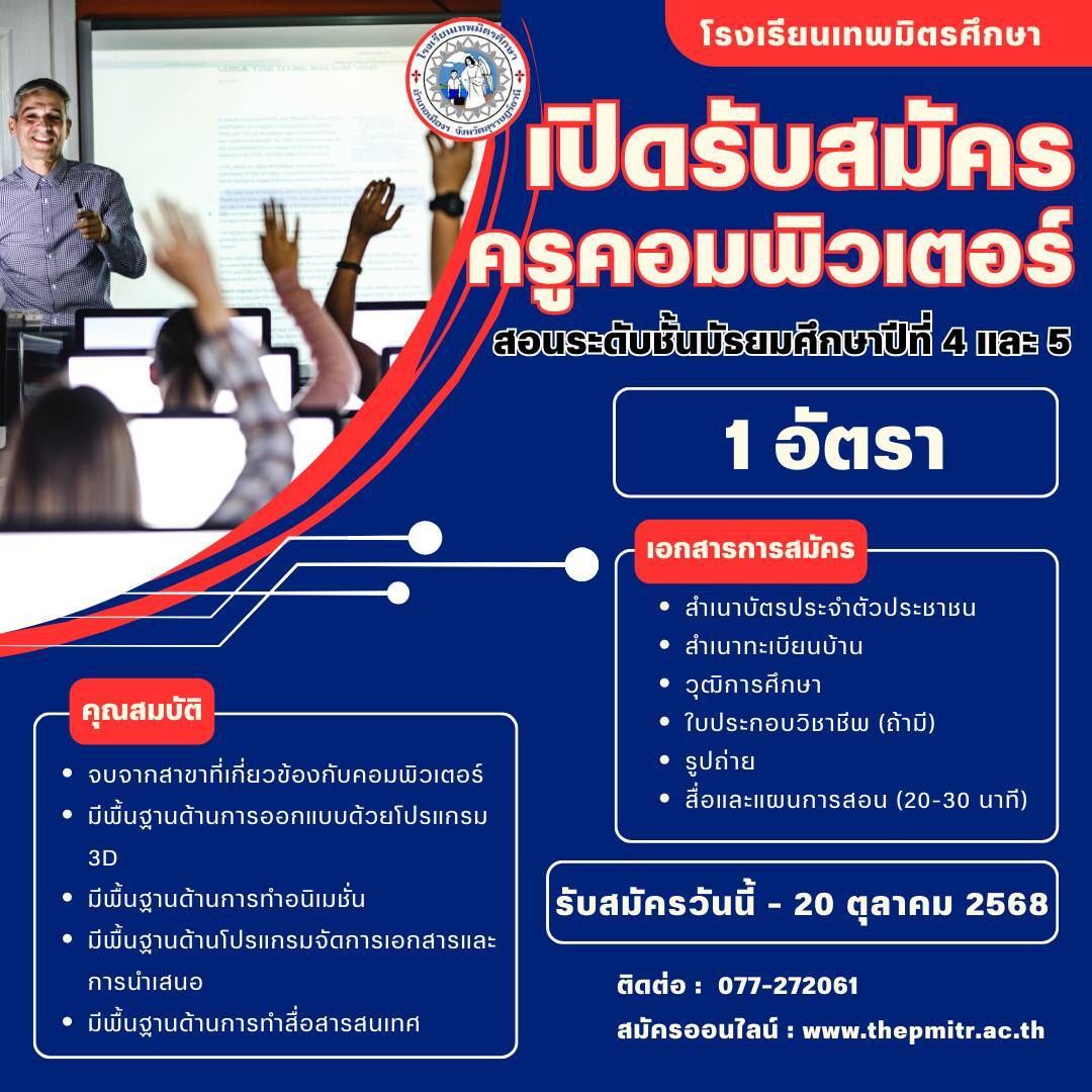 เปิดรับสมัครครูคอมพิวเตอร์ สอนระดับชั้นมัธยมศึกษาปีที่ 4 และ 5